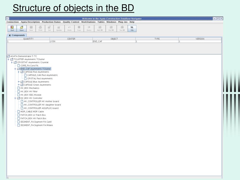 Introduction • Oracle DataBase (the server) and a graphical interface BigBrowser (java client) conceived and developed by the CMS Team Tracker • This tool has been accepted by the «Agata Management Board = the official Agata construction DataBase • The Computer Center of the IN2P3: hosts the database part: a test DB and a production DB have been created • The Infrastructure group began to work with us to define the structure of the database