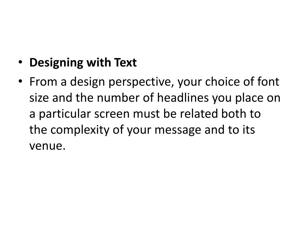 Designing with Text • From a design perspective, your choice of font size and the number of headlines you place on a particular screen must be related both to the complexity of your message and to its venue.