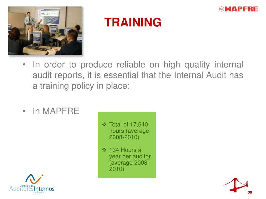 TRAINING • Total of 17,640 hours (average 2008-2010) • 134 Hours a year per auditor (average 2008-2010) In orderto produce reliableonhighqualityinternalauditreports, itisessentialthattheInternalAudit has a training policy in place: In MAPFRE 30