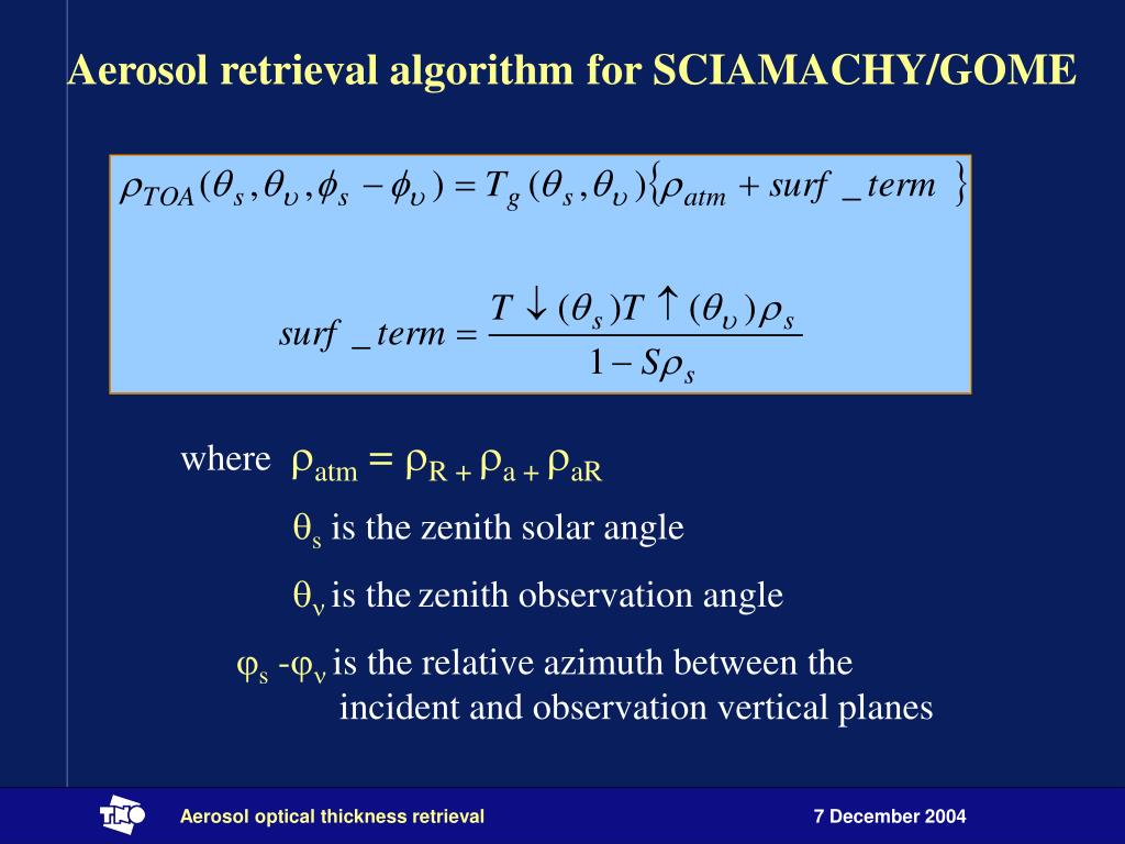 Aerosol retrieval algorithmfor SCIAMACHY/GOME where atm = R + a + aR s is the zenith solar angle is thezenith observation angle s -is the relative azimuth between the incident and observation vertical planes Aerosol optical thickness retrieval