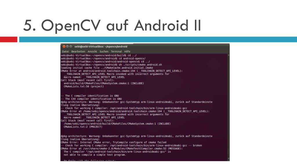 5. OpenCV auf Android I “Android is awesome, and so is OpenCV, so wouldn't it be awesome if they could work together? Well they can, and its now officially supported in OpenCV.” • eigener Trunk imOpenCV-Repository • mittels JNI (Java Native Interface) umgesetzt • UnsereErfahrung: Kompilieren & Cross-Kompilierenerfolgslos • ImmerwiederneueKompilier- & Linkerfehler • VorgehennachdiversenAnleitungenführtenichtzumErfolg (statische Shared Objects)