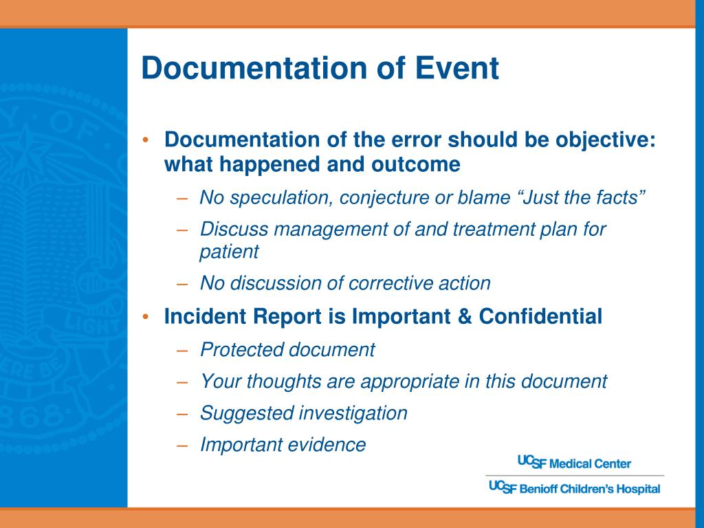 Documentation of Event Documentation of the error should be objective: what happened and outcome No speculation, conjecture or blame “Just the facts” Discuss management of and treatment plan for patient No discussion of corrective action Incident Report is Important & Confidential Protected document Your thoughts are appropriate in this document Suggested investigation Important evidence