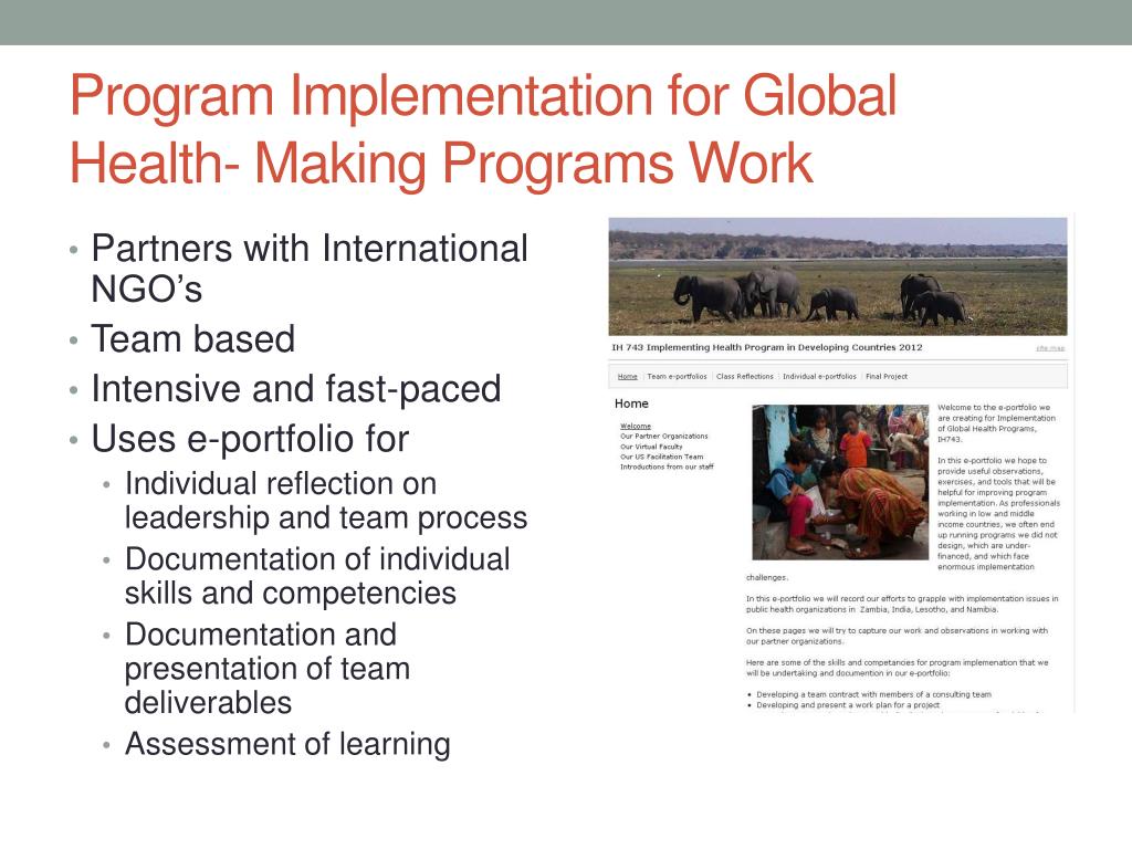 Program Implementation for Global Health- Making Programs Work • Partners with International NGO’s • Team based • Intensive and fast-paced • Uses e-portfolio for • Individual reflection on leadership and team process • Documentation of individual skills and competencies • Documentation and presentation of team deliverables • Assessment of learning