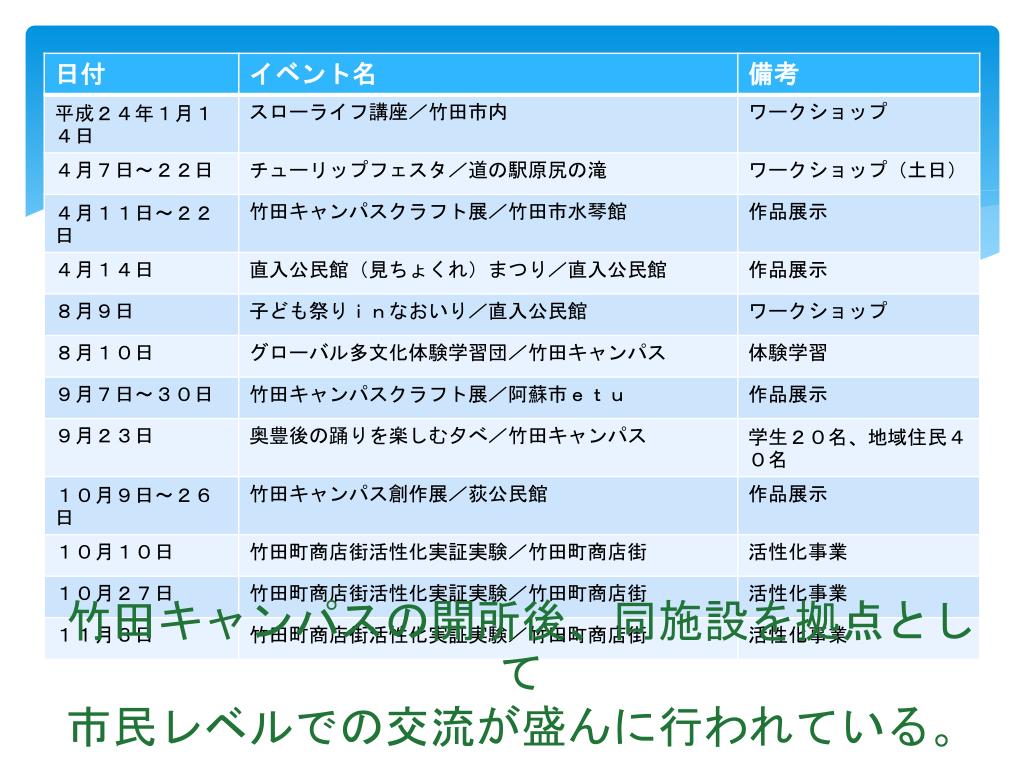 竹田キャンパスの開所後、同施設を拠点として竹田キャンパスの開所後、同施設を拠点として 市民レベルでの交流が盛んに行われている。