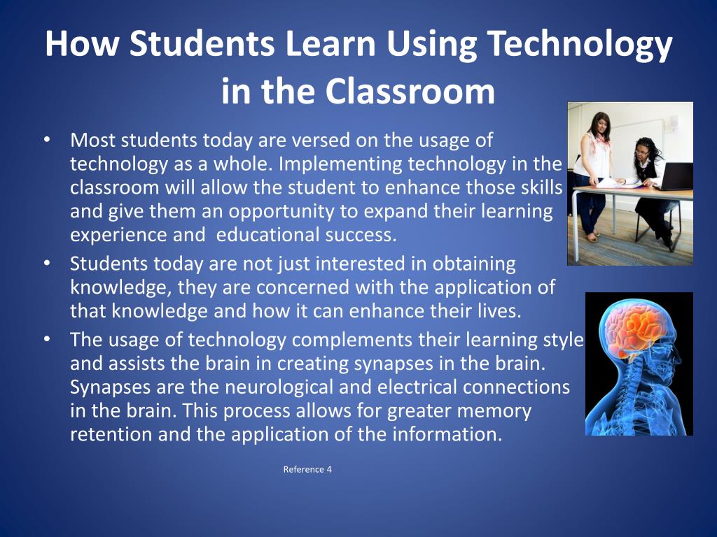 How Students Learn Using Technology in the Classroom • Most students today are versed on the usage of technology as a whole. Implementing technology in the classroom will allow the student to enhance those skills and give them an opportunity to expand their learning experience and educational success. • Students today are not just interested in obtaining knowledge, they are concerned with the application of that knowledge and how it can enhance their lives. • The usage of technology complements their learning style and assists the brain in creating synapses in the brain. Synapses are the neurological and electrical connections in the brain. This process allows for greater memory retention and the application of the information. Reference 4
