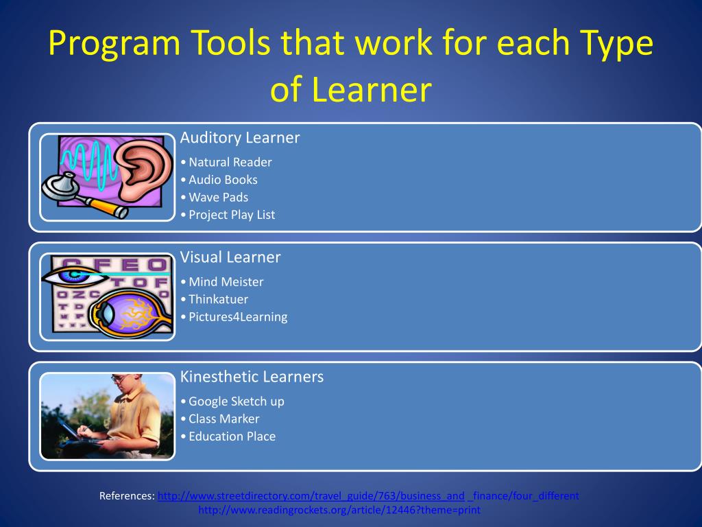 Program Tools that work for each Type of Learner References: http://www.streetdirectory.com/travel_guide/763/business_and _finance/four_different http://www.readingrockets.org/article/12446?theme=print