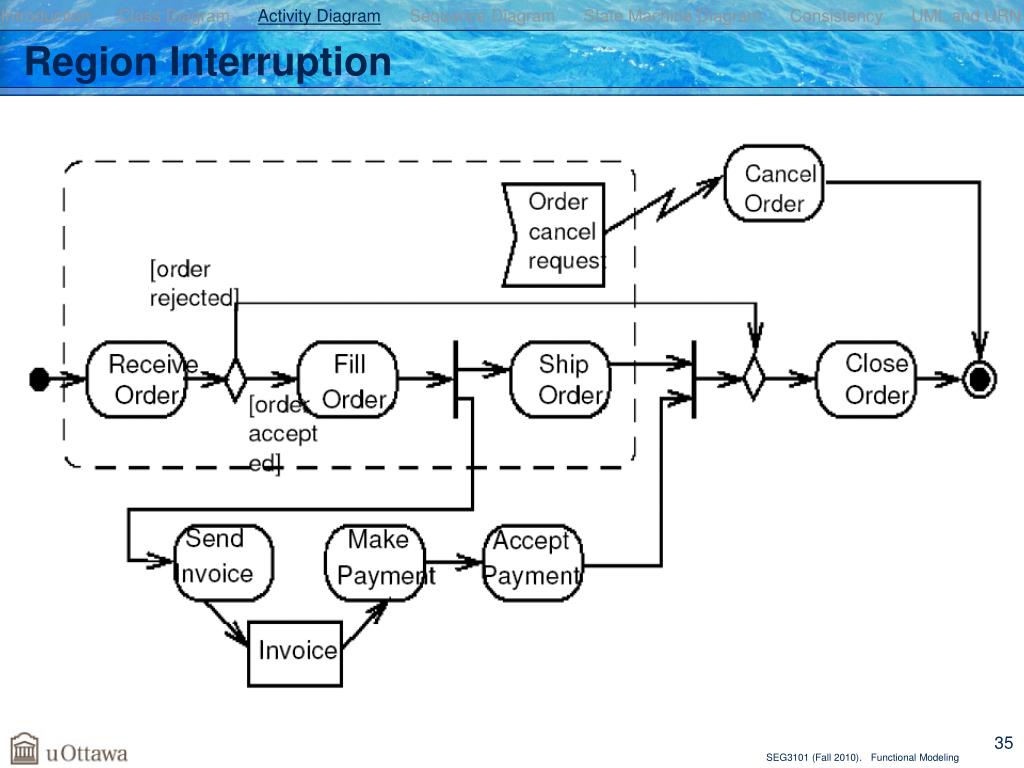 Introduction Class Diagram Activity Diagram Sequence Diagram State Machine Diagram Consistency UML and URN Unique to Activity Diagrams • Data flow modeling • Interruptible regions • Conditions on parallelism (branches of an AND-fork) • Constraints on action pins • Integration with UML