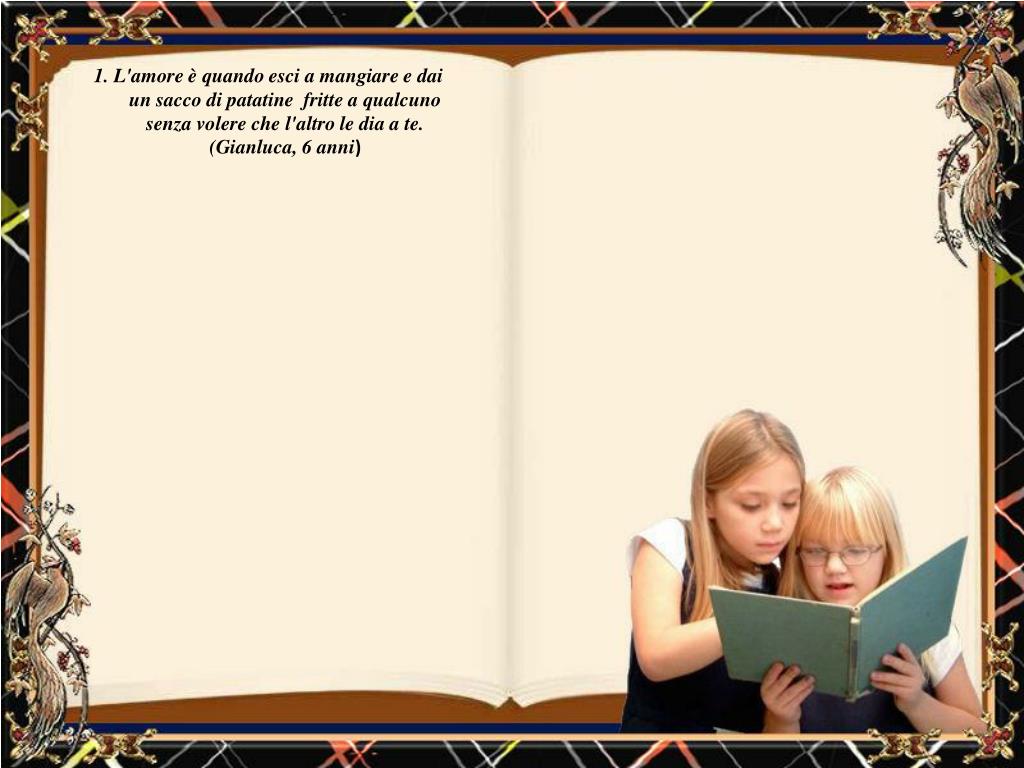 1. L'amore è quando esci a mangiare e dai un sacco di patatine frittea qualcuno senza volere che l'altro le dia a te.(Gianluca, 6 anni)