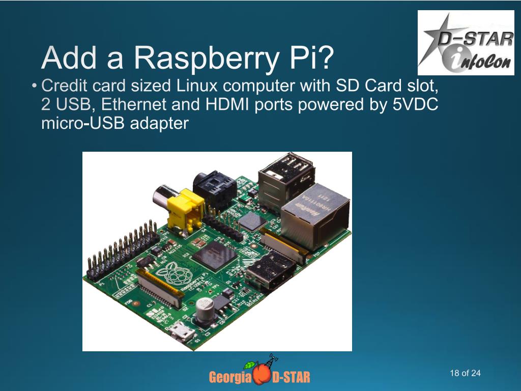 DVAP / Pi Configuration DVAP connects to Pi through USB Wi-Fi adapter on 2nd USB (external Internet source required) SD card with OS and DVAP software Micro USB power to AC or DC source