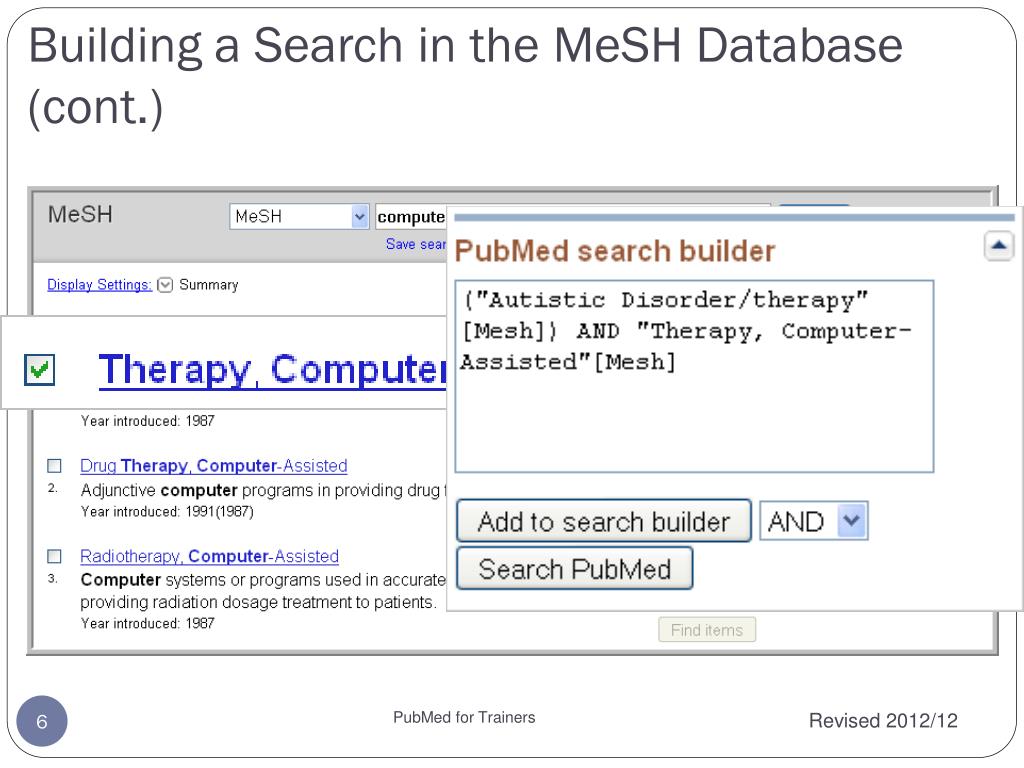 Building a Search in the MeSH Database (cont.) PubMed for Trainers