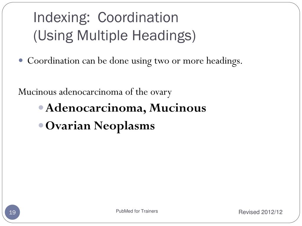 Indexing: Coordination (Using Multiple Headings) • Coordination can be done using two or more headings. Mucinous adenocarcinoma of the ovary • Adenocarcinoma, Mucinous • Ovarian Neoplasms PubMed for Trainers