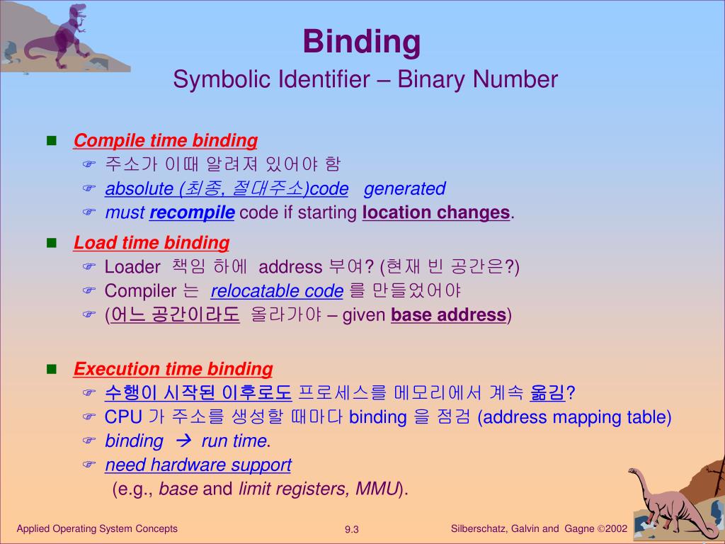 Binding Symbolic Identifier – Binary Number • Compile time binding • 주소가 이때 알려져 있어야 함 • absolute (최종, 절대주소)code generated • mustrecompile code if starting location changes. • Load time binding • Loader 책임 하에 address 부여? (현재 빈 공간은?) • Compiler 는 relocatable code를 만들었어야 • (어느 공간이라도 올라가야 – given base address) • Execution time binding • 수행이 시작된 이후로도 프로세스를 메모리에서 계속 옮김? • CPU 가 주소를 생성할 때마다 binding 을 점검 (address mapping table) • binding run time. • need hardware support (e.g., base and limit registers, MMU). Applied Operating System Concepts