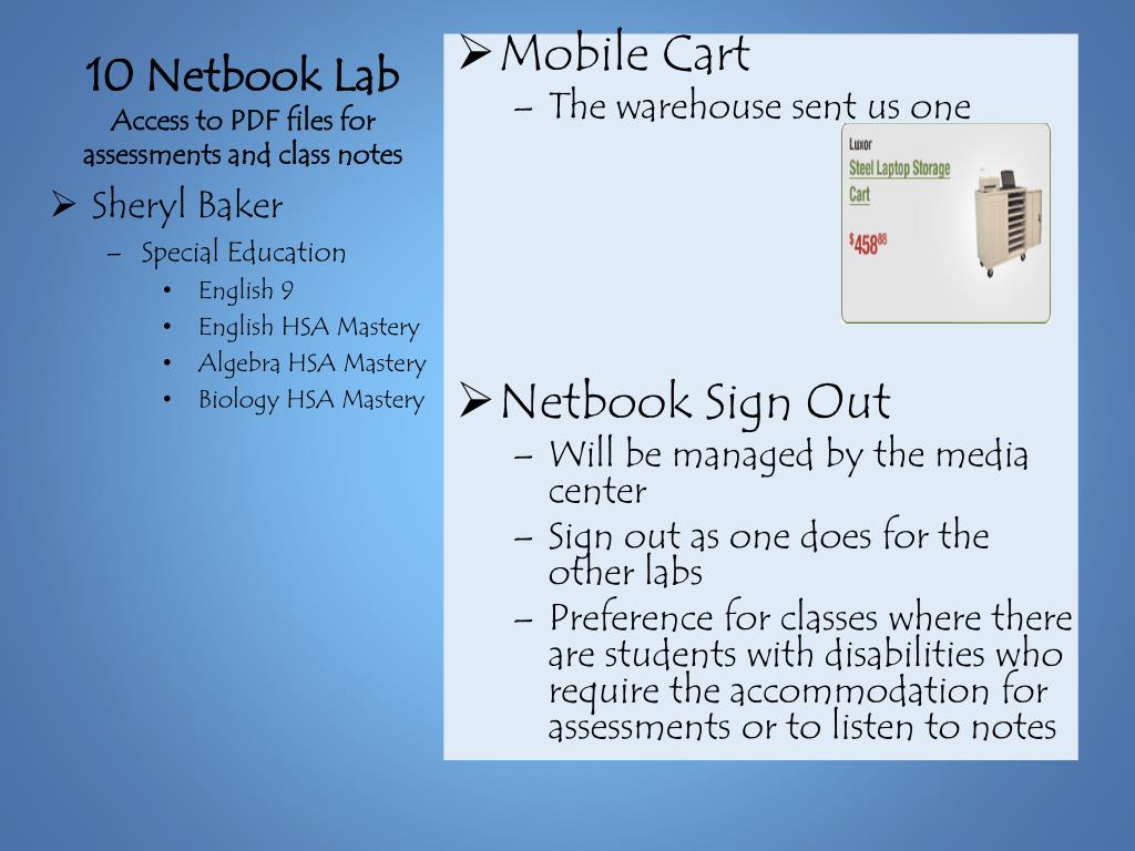 Mobile Cart • The warehouse sent us one • Netbook Sign Out • Will be managed by the media center • Sign out as one does for the other labs • Preference for classes where there are students with disabilities who require the accommodation for assessments or to listen to notes 10 Netbook LabAccess to PDF files for assessments and class notes • Sheryl Baker • Special Education • English 9 • English HSA Mastery • Algebra HSA Mastery • Biology HSA Mastery