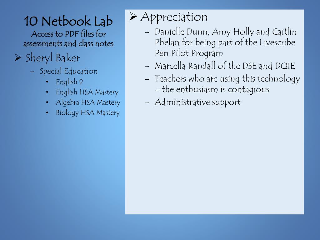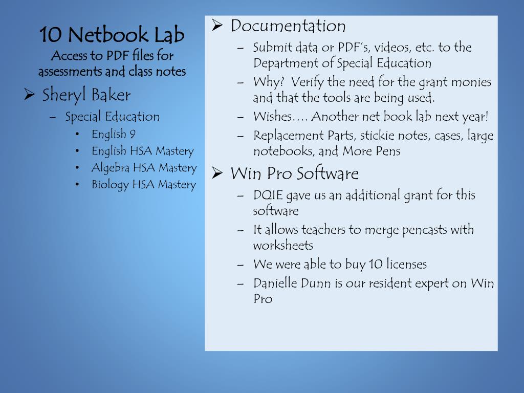 Documentation • Submit data or PDF’s, videos, etc. to the Department of Special Education • Why? Verify the need for the grant monies and that the tools are being used. • Wishes…. Another net book lab next year! • Replacement Parts, stickie notes, cases, large notebooks, and More Pens • Win Pro Software • DQIE gave us an additional grant for this software • It allows teachers to merge pencasts with worksheets • We were able to buy 10 licenses • Danielle Dunn is our resident expert on Win Pro 10 Netbook LabAccess to PDF files for assessments and class notes • Sheryl Baker • Special Education • English 9 • English HSA Mastery • Algebra HSA Mastery • Biology HSA Mastery