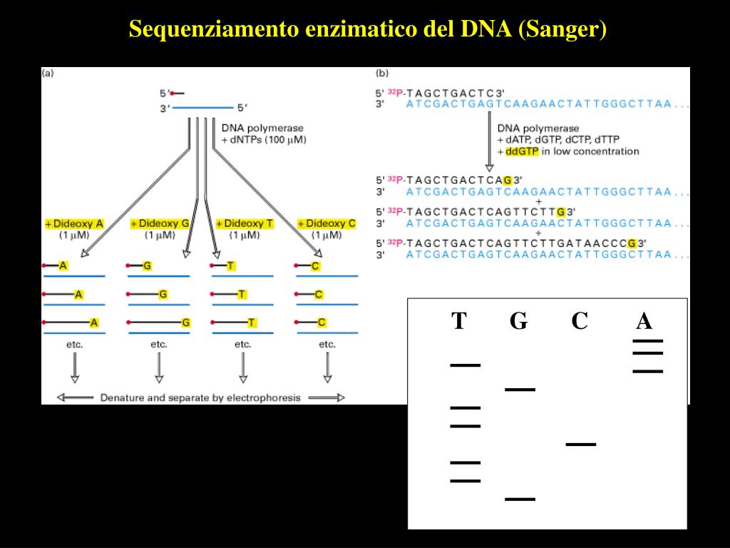 Sequenziamento enzimatico del DNA (Sanger). T G C A. 5’. 3’. TTACGTAACGTCAGAACGTCCGGAACGTAGGGGTCGCGCGTT. AATGCATTGCAGTCTTGCAGGCCTTGCATCCCCAGCGCGCAA. 3’. 5’. 5’. 3’. TTACGTAACGTCAGAACGTCCGGAACGTAGGGGTCGCGCGTT. AATGCATTGCAGTCTTGCAGGCCTTGCATCCCCAGCGCGCAA. 3’. 5’.