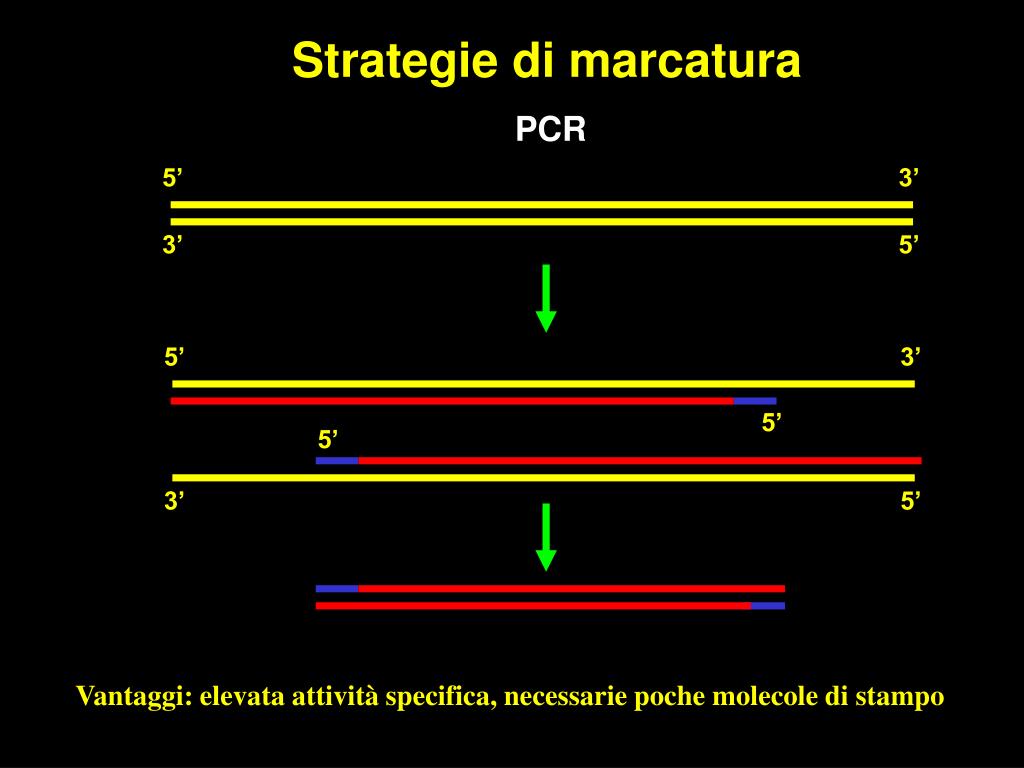 5’ 3’ 3’ 5’ 5’ 3’ 5’ 5’ 3’ 5’ Strategie di marcatura PCR Vantaggi: elevata attività specifica, necessarie poche molecole di stampo