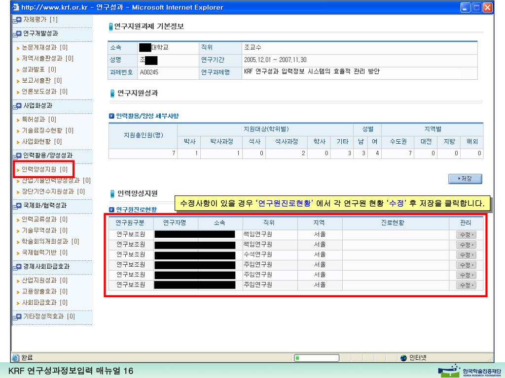 수정사항이 있을 경우 ‘연구원진로현황’ 에서 각 연구원 현황 ‘수정’ 후 저장을 클릭합니다.