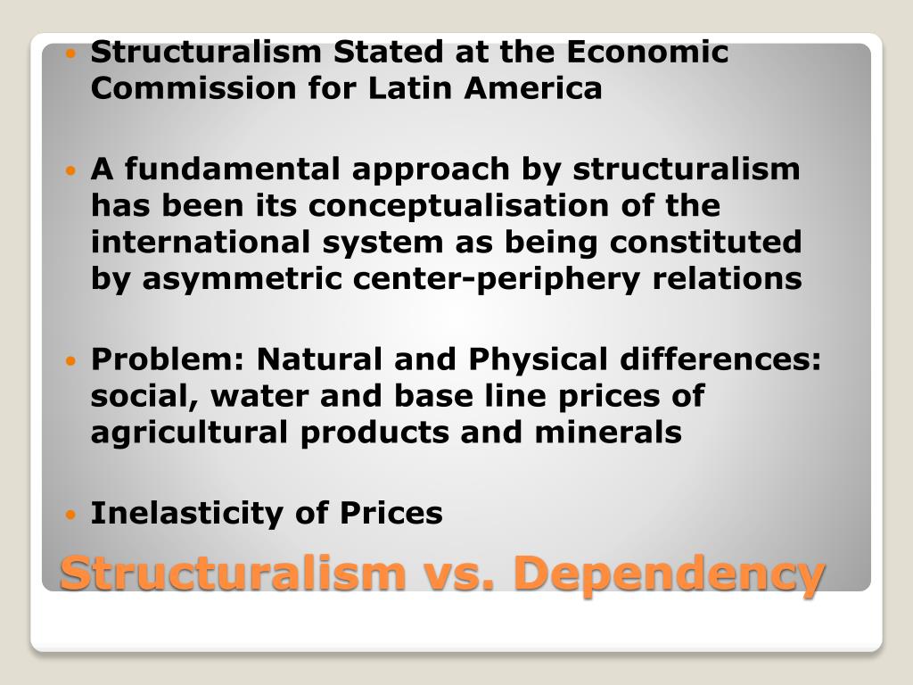 Structuralism Stated at the Economic Commission for Latin America • A fundamental approach by structuralism has been its conceptualisation of the international system as being constituted by asymmetric center-periphery relations • Problem: Natural and Physical differences: social, water and base line prices of agricultural products and minerals • Inelasticity of Prices Structuralism vs. Dependency
