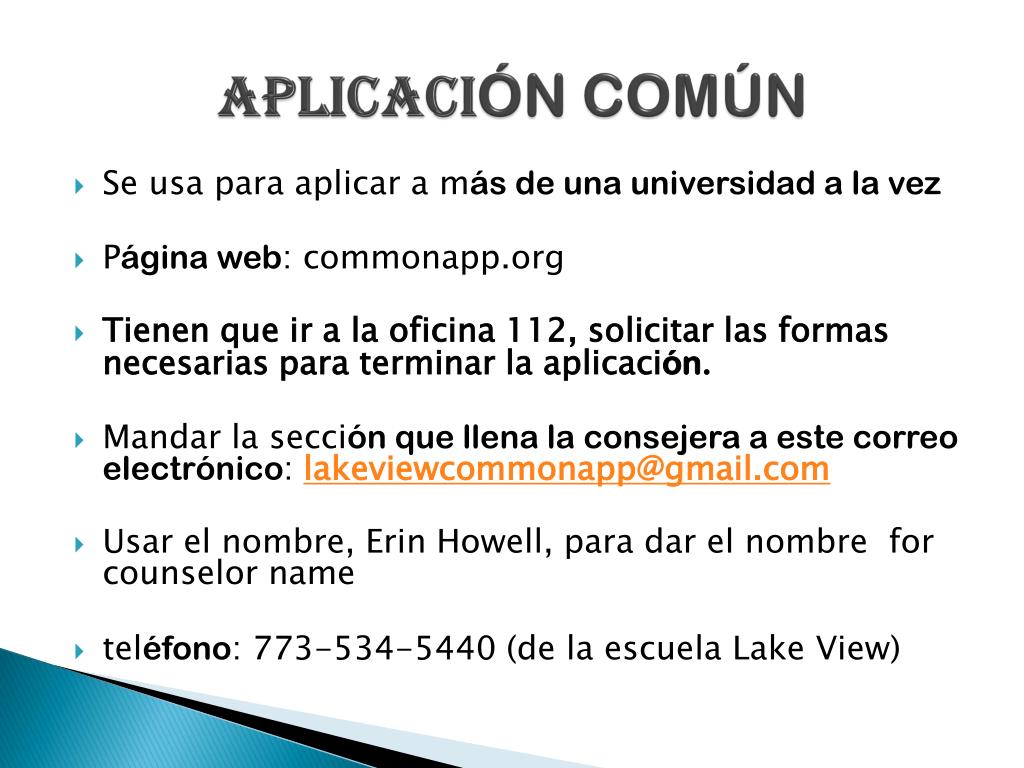 aplicaciÓN COMÚN • Se usaparaaplicar a más de unauniversidad a la vez • Página web: commonapp.org • Tienenqueir a la oficina 112, solicitarlasformasnecesariasparaterminar la aplicación. • Mandar la secciónquellena la consejera a estecorreoelectrónico: lakeviewcommonapp@gmail.com • Usar el nombre, Erin Howell, paradar el nombre for counselor name • teléfono: 773-534-5440 (de la escuela Lake View)