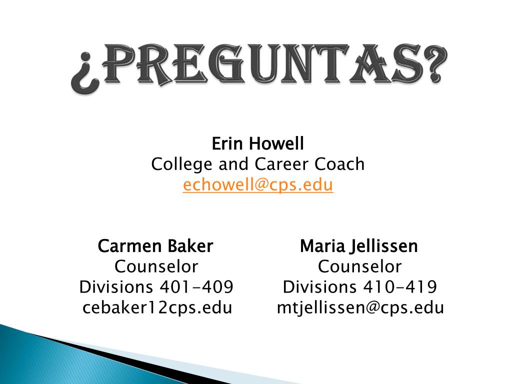¿Preguntas? Erin Howell College and Career Coach echowell@cps.edu Carmen Baker Maria Jellissen Counselor Counselor Divisions 401-409 Divisions 410-419 cebaker12cps.edu mtjellissen@cps.edu