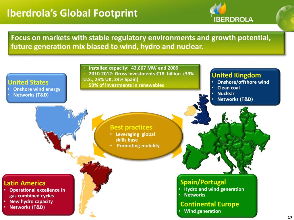 Iberdrola’s Global Footprint Focus on markets with stable regulatory environments and growth potential, future generation mix biased to wind, hydro and nuclear. • Installed capacity: 43,667 MW end 2009 • 2010-2012: Gross investments €18 billion (39% U.S., 25% UK, 24% Spain) • 50% of investments in renewables • United Kingdom • Onshore/offshore wind • Clean coal • Nuclear • Networks (T&D) • United States • Onshore wind energy • Networks (T&D) • Best practices • Leveraging global skills base • Promoting mobility • Latin America • Operational excellence in gas combined cycles • New hydro capacity • Networks (T&D) • Spain/Portugal • Hydro and wind generation • Networks • Continental Europe • Wind generation 17