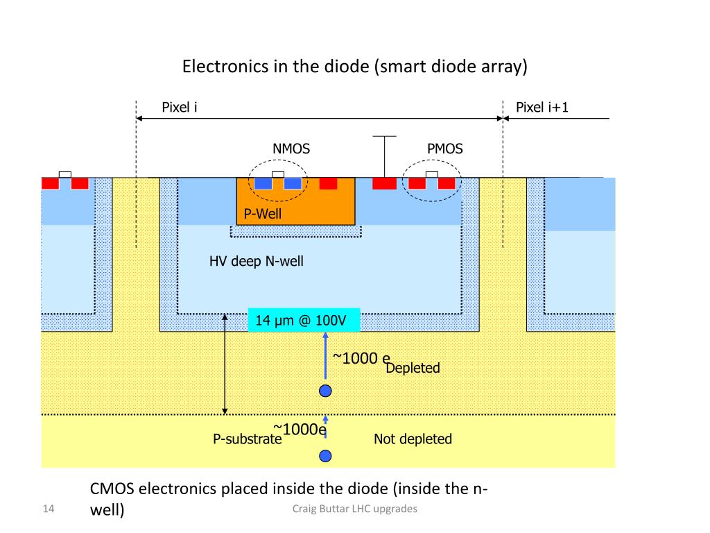 Electronics in the diode (smart diode array) Pixel i Pixel i+1 NMOS PMOS P-Well HV deep N-well 14μm@ 100V ~1000 e Depleted ~1000e P-substrate Not depleted • CMOS electronics placed inside the diode (inside the n-well) Craig Buttar LHC upgrades