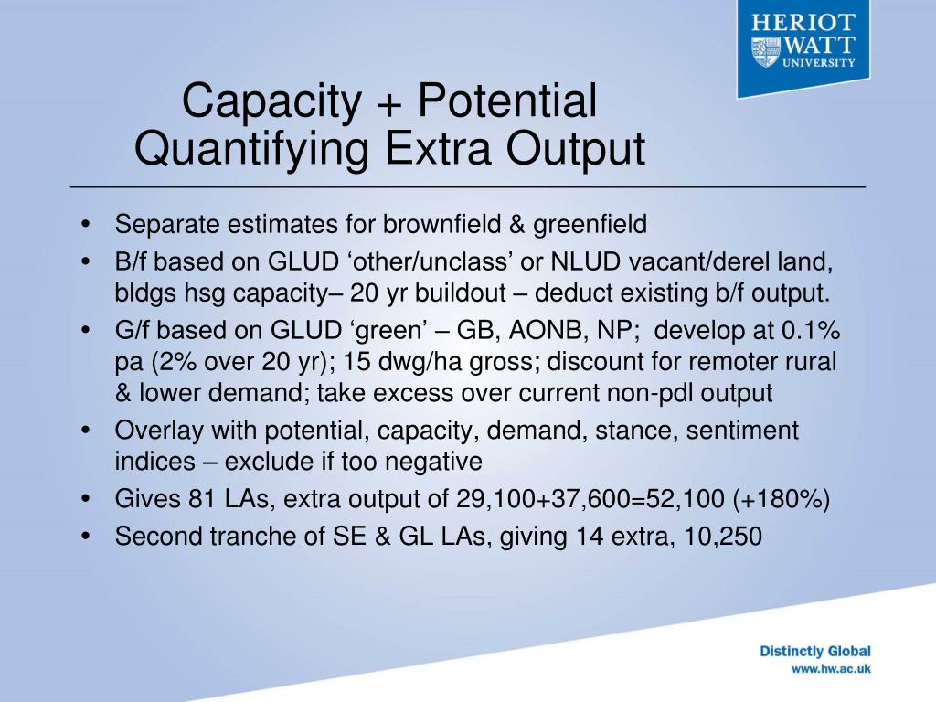 Capacity + PotentialQuantifying Extra Output Separate estimates for brownfield & greenfield B/f based on GLUD ‘other/unclass’ or NLUD vacant/derel land, bldgs hsg capacity– 20 yr buildout – deduct existing b/f output. G/f based on GLUD ‘green’ – GB, AONB, NP; develop at 0.1% pa (2% over 20 yr); 15 dwg/ha gross; discount for remoter rural & lower demand; take excess over current non-pdl output Overlay with potential, capacity, demand, stance, sentiment indices – exclude if too negative Gives 81 LAs, extra output of 29,100+37,600=52,100 (+180%) Second tranche of SE & GL LAs, giving 14 extra, 10,250