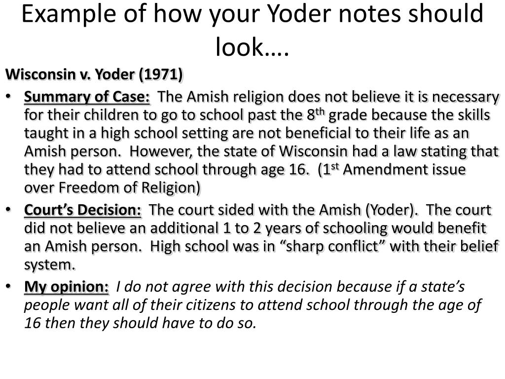 Example of how your Yoder notes should look…. Wisconsin v. Yoder (1971) • Summary of Case: The Amish religion does not believe it is necessary for their children to go to school past the 8th grade because the skills taught in a high school setting are not beneficial to their life as an Amish person. However, the state of Wisconsin had a law stating that they had to attend school through age 16. (1st Amendment issue over Freedom of Religion) • Court’s Decision: The court sided with the Amish (Yoder). The court did not believe an additional 1 to 2 years of schooling would benefit an Amish person. High school was in “sharp conflict” with their belief system. • My opinion:I do not agree with this decision because if a state’s people want all of their citizens to attend school through the age of 16 then they should have to do so.