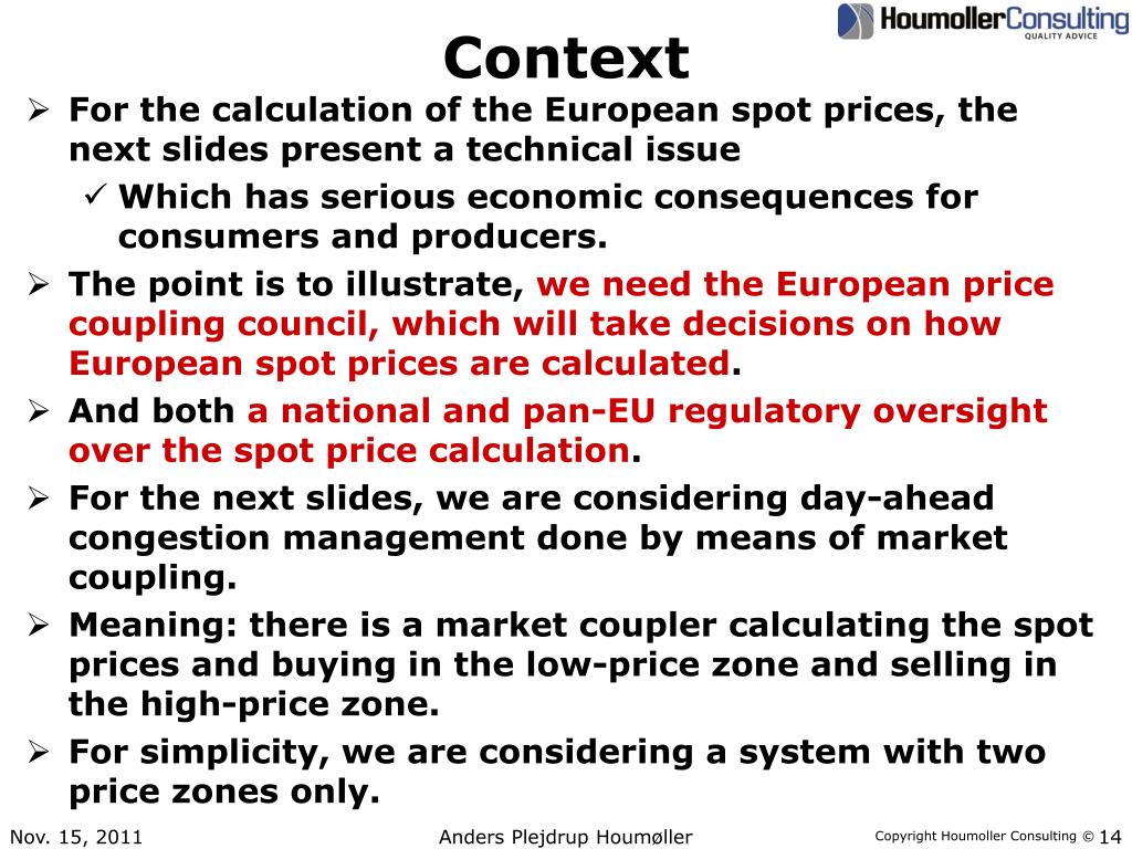 Context • For the calculation of the European spot prices, the next slides present a technical issue • Which has serious economic consequences for consumers and producers. • The point is to illustrate, we need the European price coupling council, which will take decisions on how European spot prices are calculated. • And both a national and pan-EU regulatory oversight over the spot price calculation. • For the next slides, we are considering day-ahead congestion management done by means of market coupling. • Meaning: there is a market coupler calculating the spot prices and buying in the low-price zone and selling in the high-price zone. • For simplicity, we are considering a system with two price zones only. Anders Plejdrup Houmøller