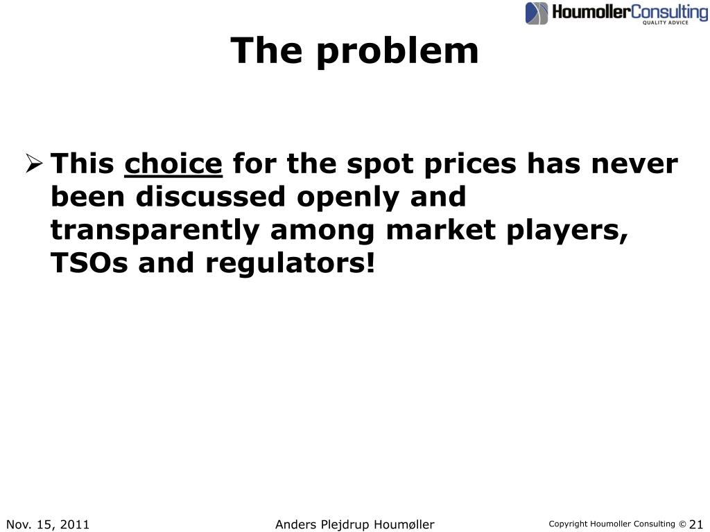 The problem • This choice for the spot prices has never been discussed openly and transparently among market players, TSOs and regulators! Anders Plejdrup Houmøller