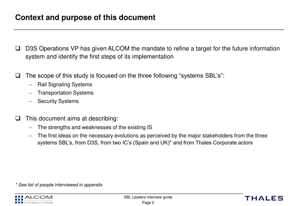 Context and purpose of this document • D3S Operations VP has given ALCOM the mandate to refine a target for the future information system and identify the first steps of its implementation • The scope of this study is focused on the three following “systems SBL’s”: • Rail Signaling Systems • Transportation Systems • Security Systems • This document aims at describing: • The strengths and weaknesses of the existing IS • The first ideas on the necessary evolutions as perceived by the major stakeholders from the three systems SBL’s, from D3S, from two IC’s (Spain and UK)* and from Thales Corporate actors * See list of people interviewed in appendix
