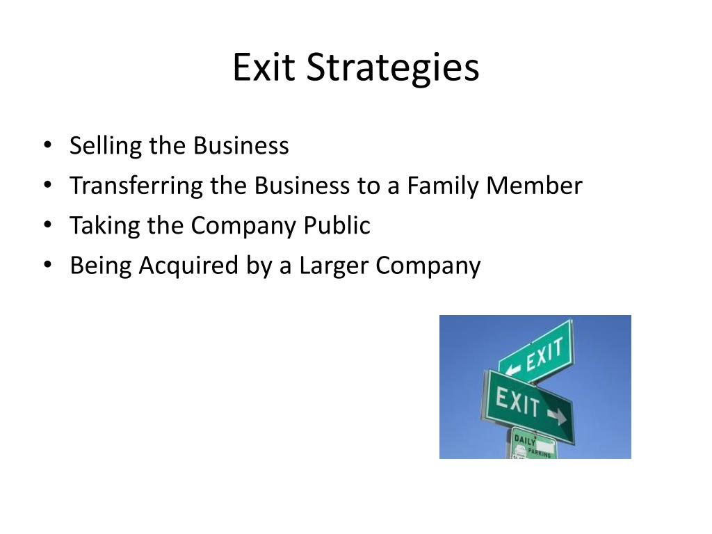 Exit Strategies • Selling the Business • Transferring the Business to a Family Member • Taking the Company Public • Being Acquired by a Larger Company