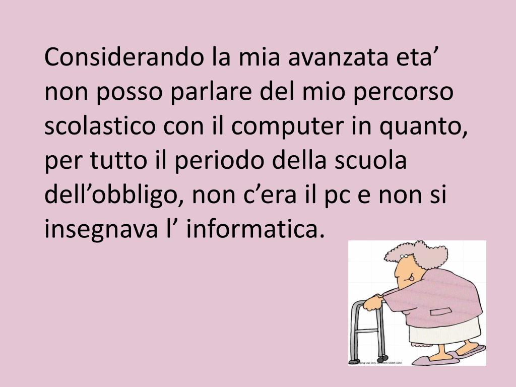 Considerando la mia avanzata eta’ non posso parlare del mio percorso scolastico con il computer in quanto, per tutto il periodo della scuola dell’obbligo, non c’era il pc e non si insegnava l’ informatica.