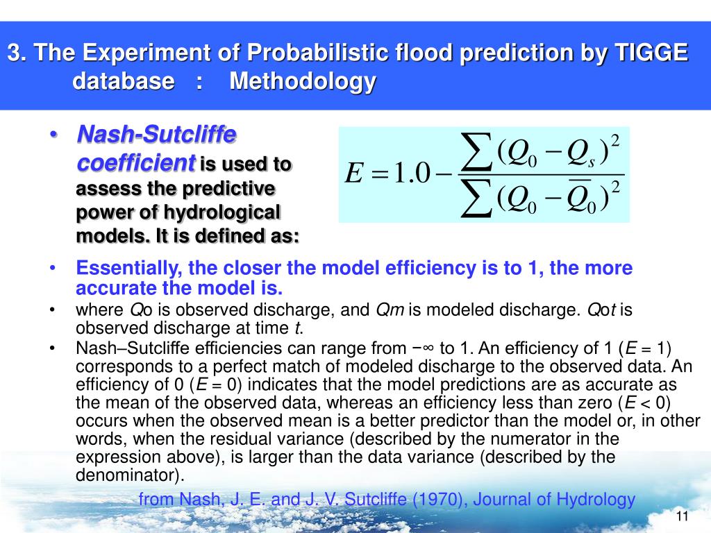 Nash-Sutcliffe coefficient is used to assess the predictive power of hydrological models. It is defined as: 3. The Experiment of Probabilistic flood prediction by TIGGE database : Methodology • Essentially, the closer the model efficiency is to 1, the more accurate the model is. • where Qo is observed discharge, and Qm is modeled discharge. Qot is observed discharge at time t. • Nash–Sutcliffe efficiencies can range from −∞ to 1. An efficiency of 1 (E = 1) corresponds to a perfect match of modeled discharge to the observed data. An efficiency of 0 (E = 0) indicates that the model predictions are as accurate as the mean of the observed data, whereas an efficiency less than zero (E < 0) occurs when the observed mean is a better predictor than the model or, in other words, when the residual variance (described by the numerator in the expression above), is larger than the data variance (described by the denominator). from Nash, J. E. and J. V. Sutcliffe (1970), Journal of Hydrology