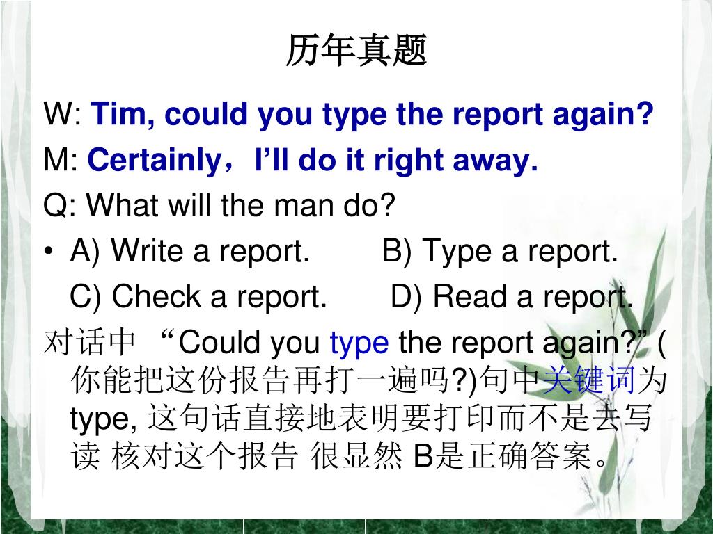 历年真题 W: Tim, could you type the report again? M: Certainly,I’ll do it right away. Q: What will the man do? • A) Write a report. B) Type a report. C) Check a report. D) Read a report. 对话中 “Could you type the report again?” (你能把这份报告再打一遍吗?)句中关键词为type, 这句话直接地表明要打印而不是去写 读 核对这个报告 很显然 B是正确答案。