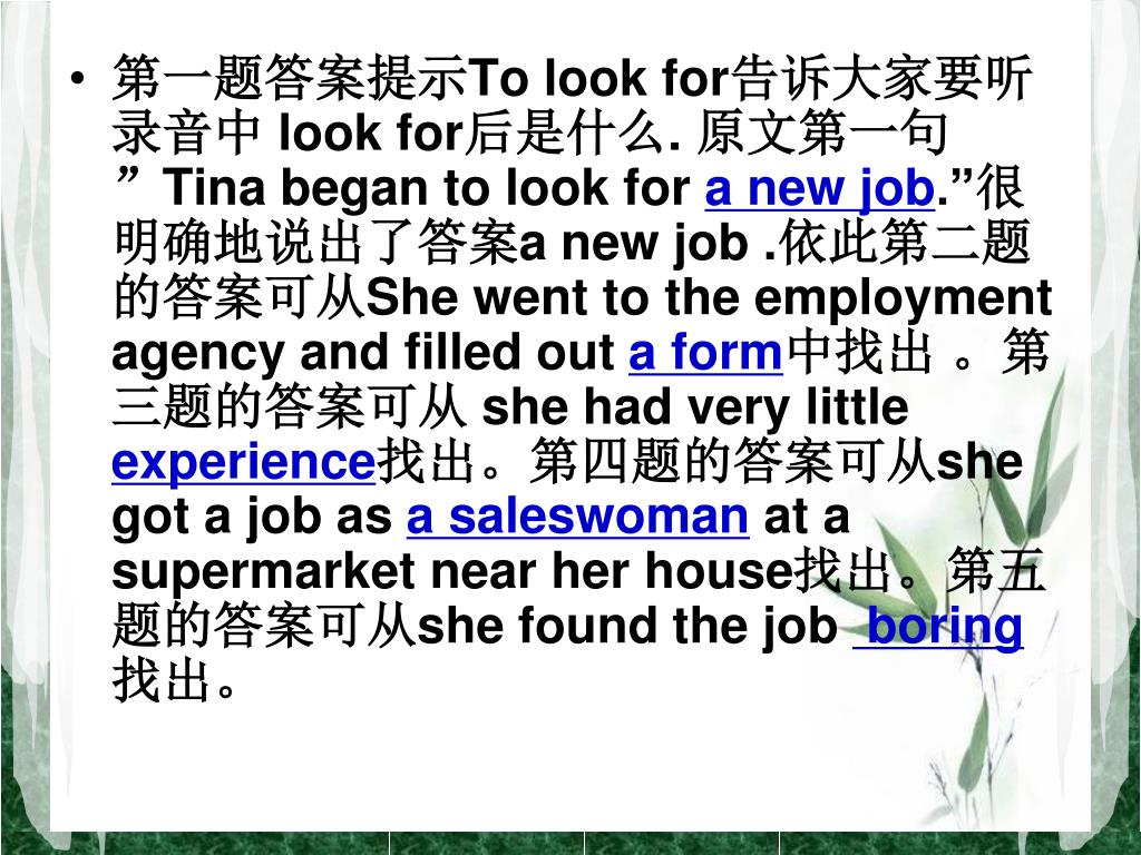 第一题答案提示To look for告诉大家要听录音中 look for后是什么. 原文第一句”Tina began to look for a new job.”很明确地说出了答案a new job .依此第二题的答案可从She went to the employment agency and filled out a form中找出 。第三题的答案可从 she had very little experience找出。第四题的答案可从she got a job as a saleswoman at a supermarket near her house找出。第五题的答案可从she found the job boring找出。