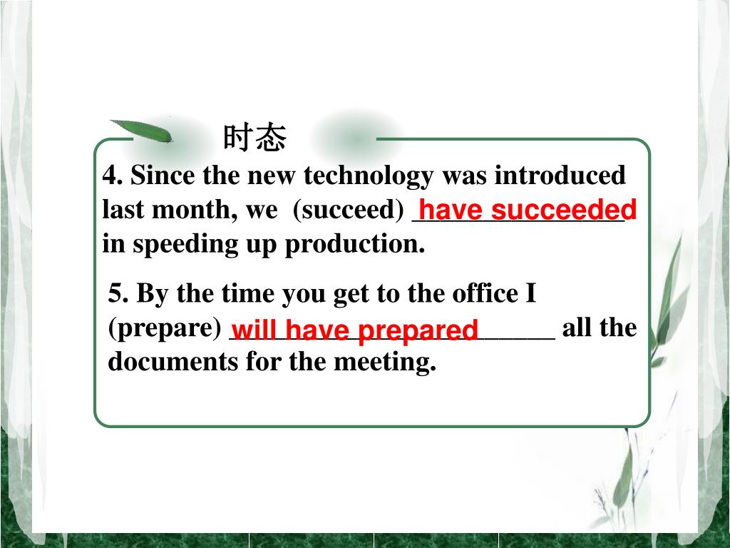 时态 4. Since the new technology was introduced last month, we (succeed) _______________ in speeding up production. have succeeded 5. By the time you get to the office I (prepare) _______________________ all the documents for the meeting. will have prepared