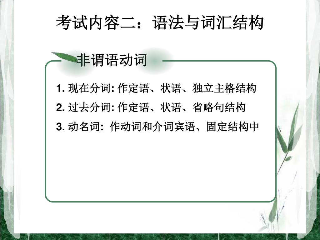 非谓语动词 考试内容二:语法与词汇结构 welcome to use these PowerPoint templates, New Content design, 10 years experience 1. 现在分词: 作定语、状语、独立主格结构 2. 过去分词: 作定语、状语、省略句结构 3. 动名词: 作动词和介词宾语、固定结构中