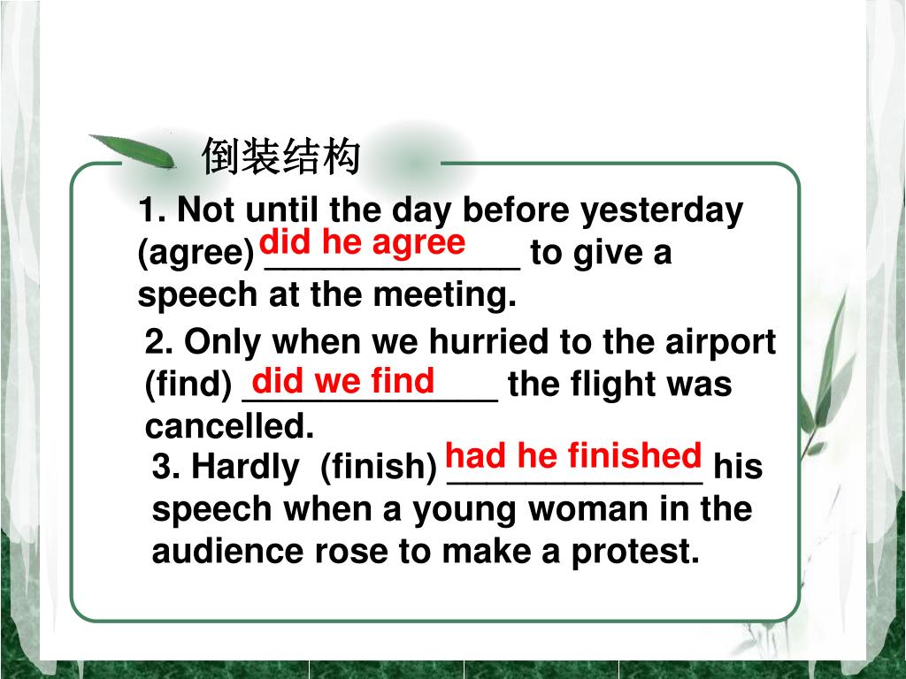 倒装结构 1. Not until the day before yesterday (agree) _____________ to give a speech at the meeting. did he agree 2. Only when we hurried to the airport (find) _____________ the flight was cancelled. did we find had he finished 3. Hardly (finish) _____________ his speech when a young woman in the audience rose to make a protest.