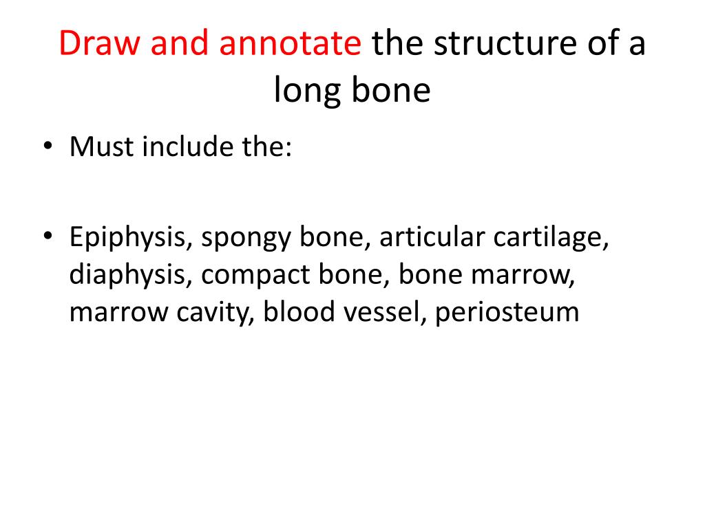 Draw and annotate the structure of a long bone • Must include the: • Epiphysis, spongy bone, articular cartilage, diaphysis, compact bone, bone marrow, marrow cavity, blood vessel, periosteum