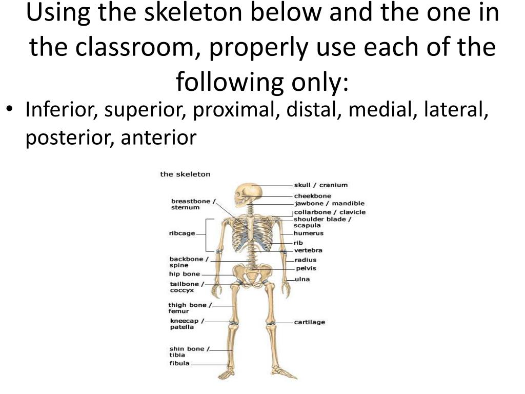 Using the skeleton below and the one in the classroom, properly use each of the following only: • Inferior, superior, proximal, distal, medial, lateral, posterior, anterior