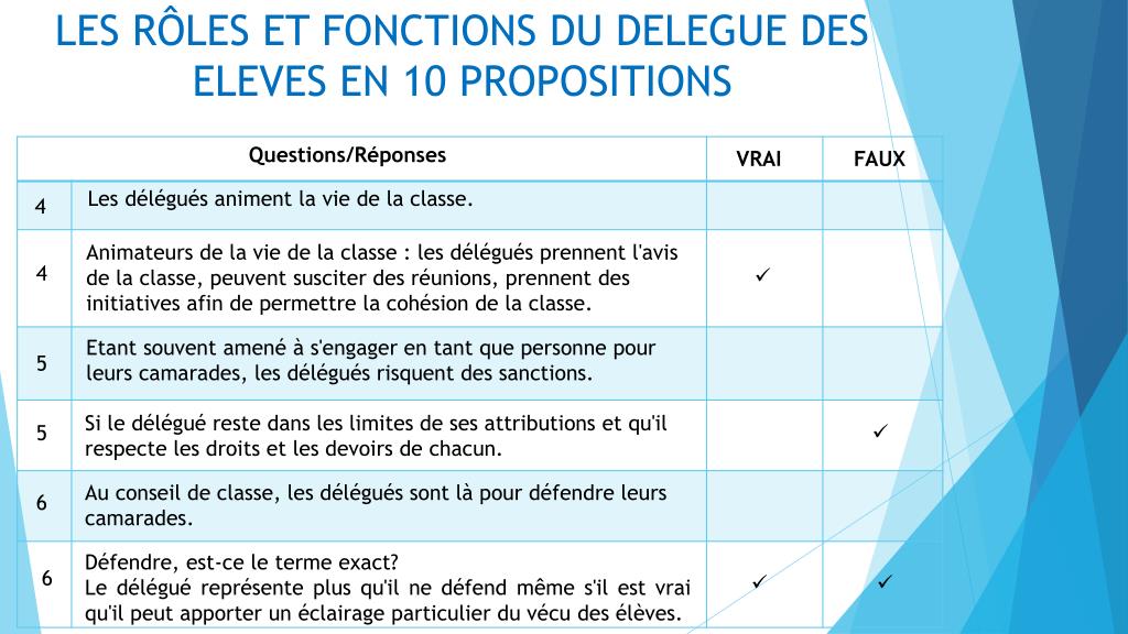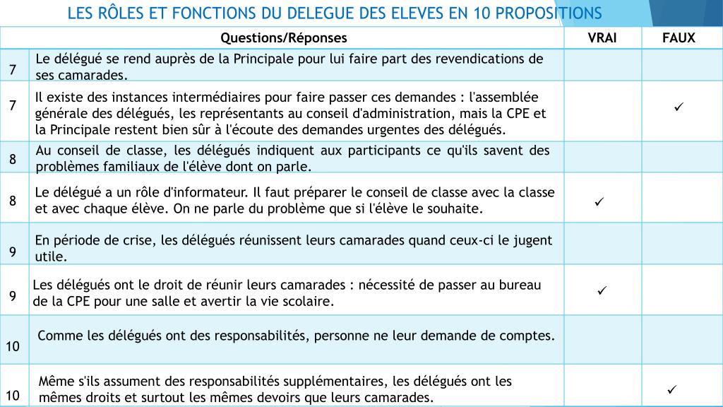 LES RÔLES ET FONCTIONS DU DELEGUE DES ELEVES EN 10 PROPOSITIONS Questions/Réponses VRAI FAUX Les délégués animent la vie de la classe. 4 Animateurs de la vie de la classe : les délégués prennent l'avis de la classe, peuvent susciter des réunions, prennent des initiatives afin de permettre la cohésion de la classe. 4 Etant souvent amené à s'engager en tant que personne pour leurs camarades, les délégués risquent des sanctions. 5 Si le délégué reste dans les limites de ses attributions et qu'il respecte les droits et les devoirs de chacun. 5 Au conseil de classe, les délégués sont là pour défendre leurs camarades. 6 Défendre, est-ce le terme exact? Le délégué représente plus qu'il ne défend même s'il est vrai qu'il peut apporter un éclairage particulier du vécu des élèves. 6