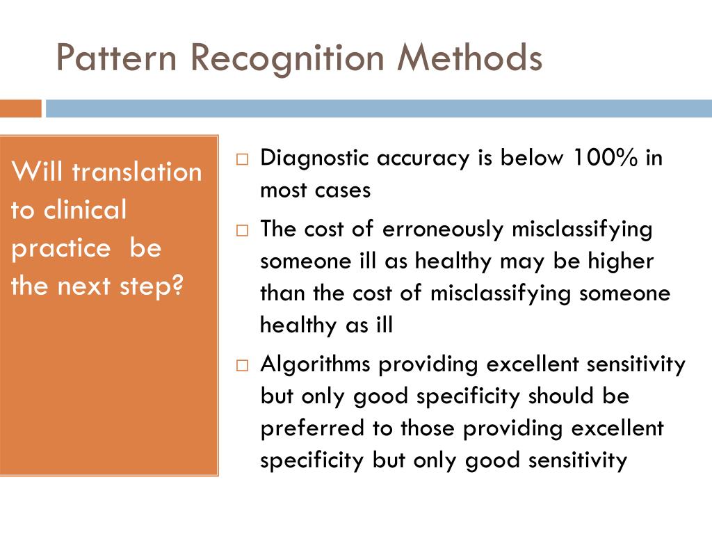 Pattern RecognitionMethods Will translationtoclinicalpracticebe the nextstep? • Diagnosticaccuracyisbelow 100% in mostcases • The costoferroneouslymisclassifying someone ill as healthy may be higher than the cost of misclassifying someone healthy as ill • Algorithms providing excellent sensitivity but only good specificity should be preferred to those providing excellent specificity but only good sensitivity