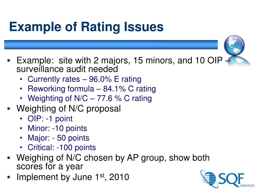 Example of Rating Issues • Example: site with 2 majors, 15 minors, and 10 OIP – surveillance audit needed • Currently rates – 96.0% E rating • Reworking formula – 84.1% C rating • Weighting of N/C – 77.6 % C rating • Weighting of N/C proposal • OIP: -1 point • Minor: -10 points • Major: - 50 points • Critical: -100 points • Weighing of N/C chosen by AP group, show both scores for a year • Implement by June 1st, 2010