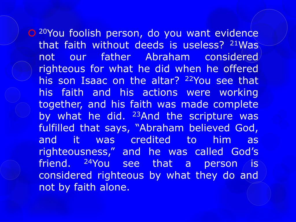 20You foolish person, do you want evidence that faith without deeds is useless? 21Was not our father Abraham considered righteous for what he did when he offered his son Isaac on the altar? 22You see that his faith and his actions were working together, and his faith was made complete by what he did. 23And the scripture was fulfilled that says, “Abraham believed God, and it was credited to him as righteousness,” and he was called God’s friend. 24You see that a person is considered righteous by what they do and not by faith alone.