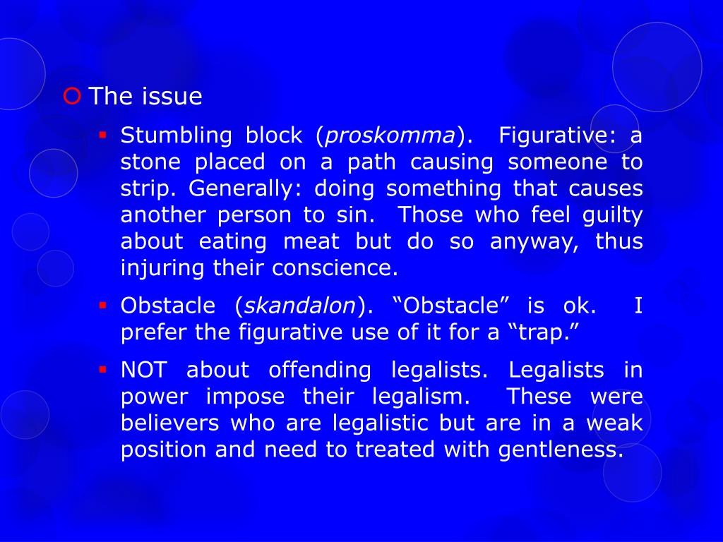 The issue • Stumbling block (proskomma). Figurative: a stone placed on a path causing someone to strip. Generally: doing something that causes another person to sin. Those who feel guilty about eating meat but do so anyway, thus injuring their conscience. • Obstacle (skandalon). “Obstacle” is ok. I prefer the figurative use of it for a “trap.” • NOT about offending legalists. Legalists in power impose their legalism. These were believers who are legalistic but are in a weak position and need to treated with gentleness.