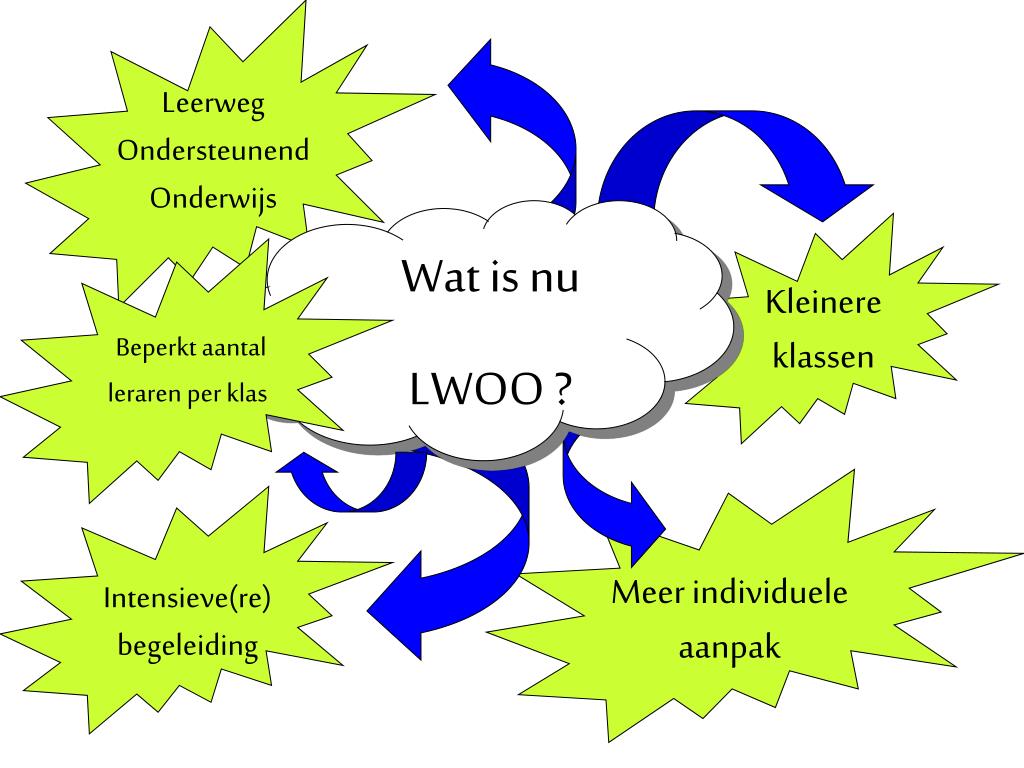 Leerweg Ondersteunend Onderwijs Wat is nu LWOO ? Kleinere klassen Beperkt aantal leraren per klas Meer individuele aanpak Intensieve(re) begeleiding