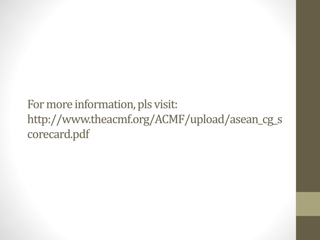 For more information, pls visit: http://www.theacmf.org/ACMF/upload/asean_cg_scorecard.pdf