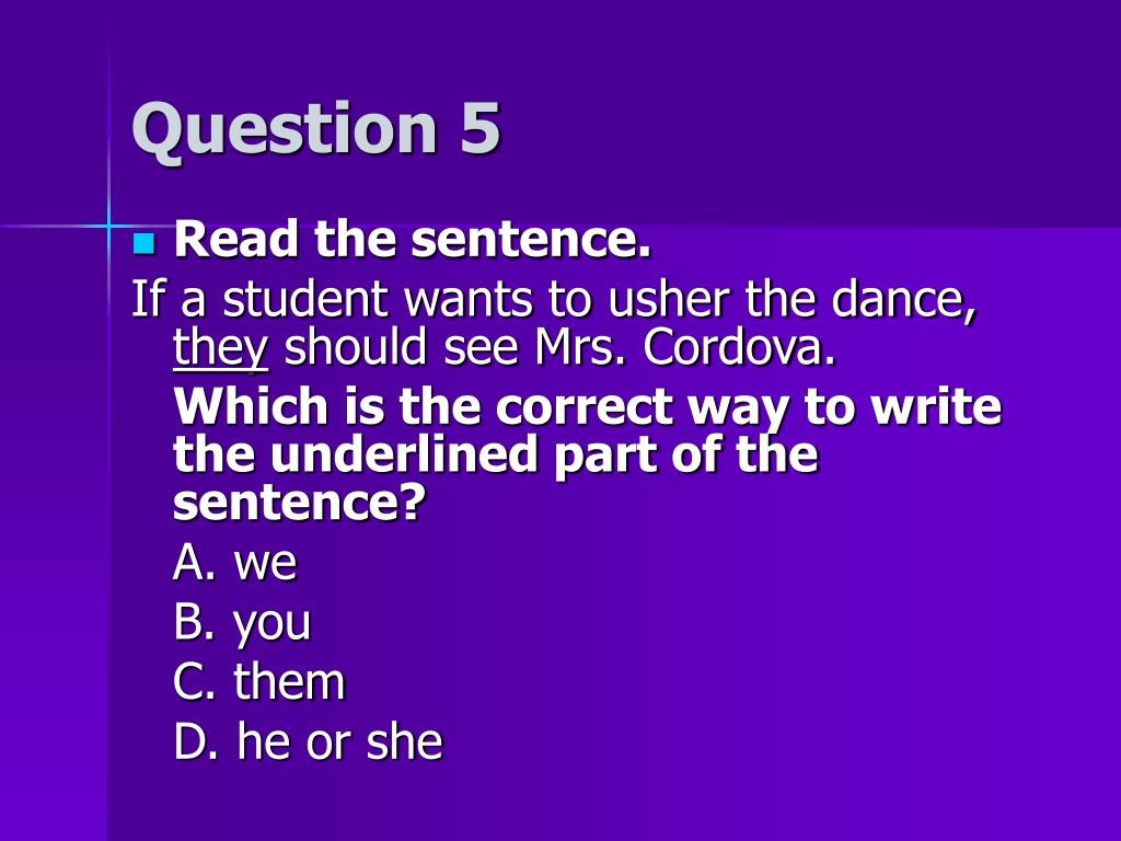 Question 5 Read the sentence. If a student wants to usher the dance, they should see Mrs. Cordova. Which is the correct way to write the underlined part of the sentence? A. we B. you C. them D. he or she