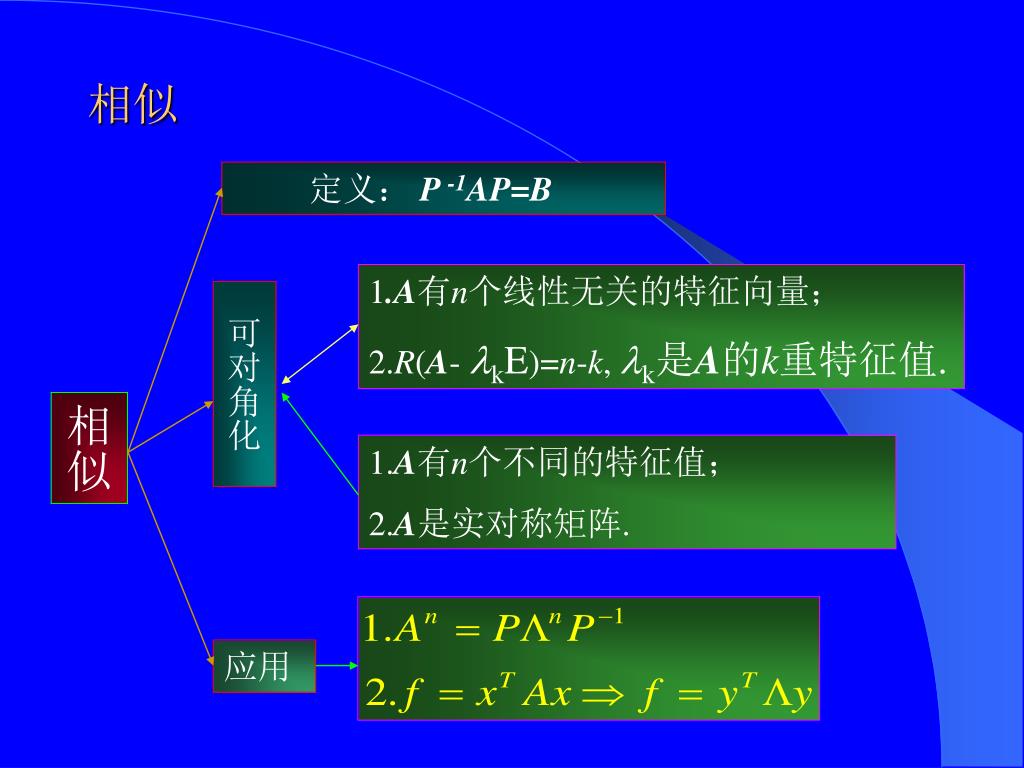 相似 定义: P -1AP=B 1.A有n个线性无关的特征向量; 2.R(A- kE)=n-k, k是A的k重特征值. 可对角化 相似 1.A有n个不同的特征值; 2.A是实对称矩阵. 应用
